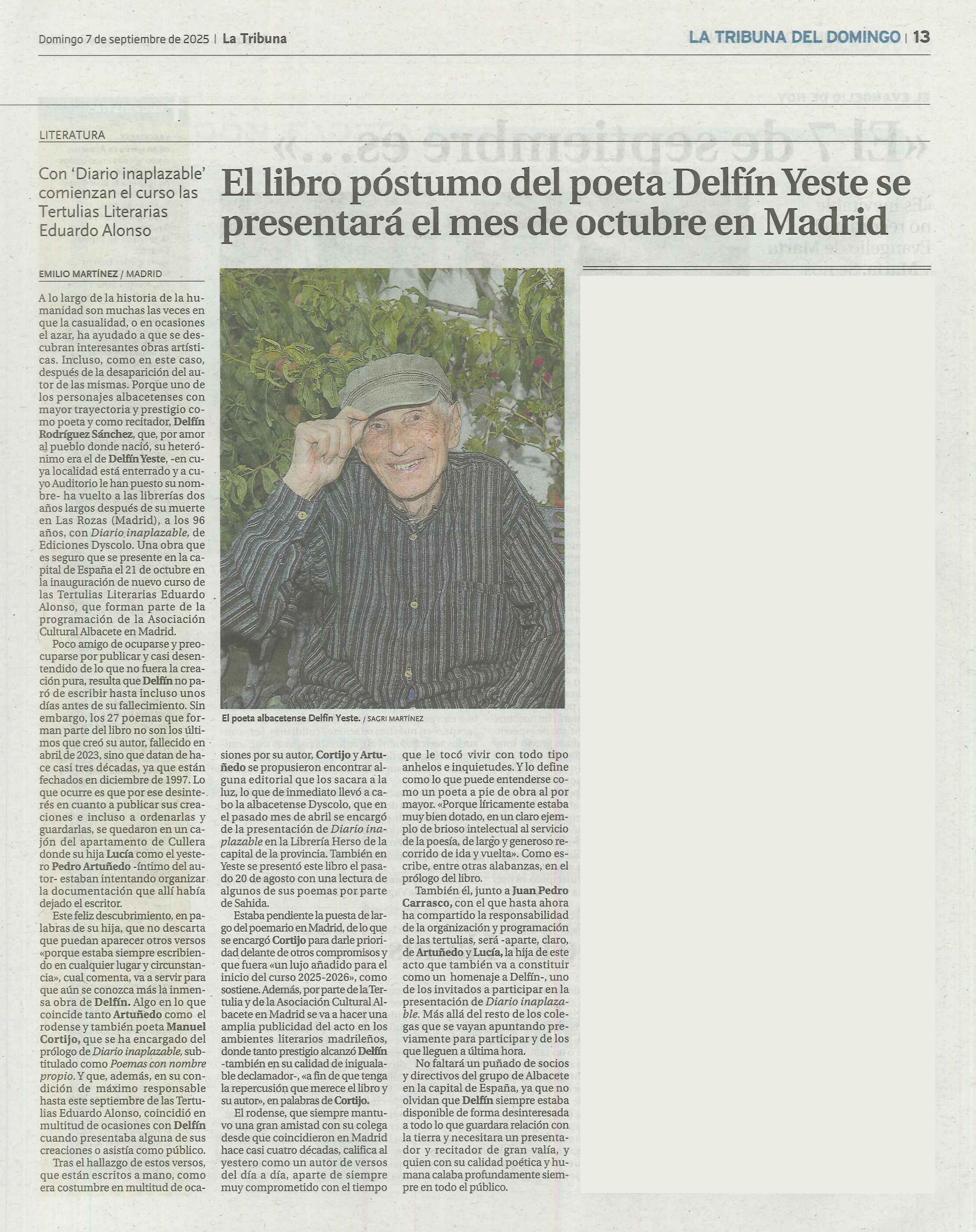 Paloma Cortina reseña a Delfín Yeste y su poemario póstumo "Diario inaplazable"